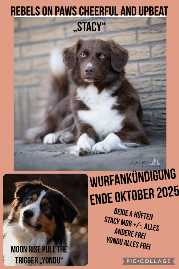 Yondu und Leni bekommen Ende Oktober Nachwuchs. Beide haben alle Gesundheitsuntersuchungen und A Hüften. Es fällt Black Bi, Black Tri, Red Bi und Red Tri. Blue Eyes möglich. Die Welpen dürfen ab Anfang Januar ausziehen. Bei Interesse bitte gerne anschreiben: 0176 578 725 17